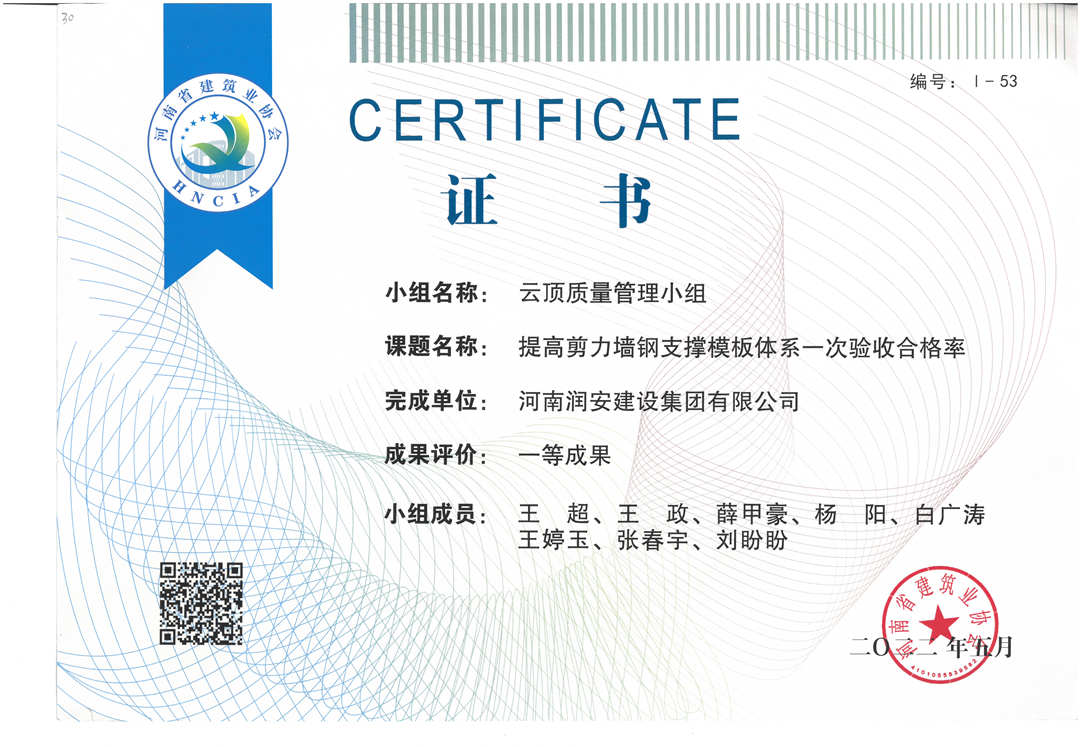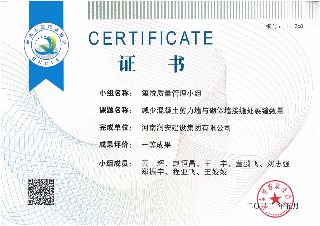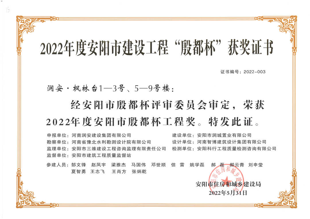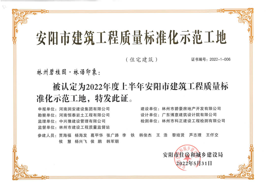 近期,集團公司承建的多個項目捷報頻傳,先后有“林州碧桂園?林語印象項目”,被評為2022年上半年安陽市建筑工程質(zhì)量標(biāo)準(zhǔn)化示范工地;潤安楓林臺1-3、5-9號樓、林州碧桂園?天璽7號樓榮獲2022年度安陽市殷都杯工程獎。同時,吾悅鴻城質(zhì)量管理小組、云頂質(zhì)量管理小組、璽悅質(zhì)量管理小組申報的三項課題均被河南省建筑業(yè)協(xié)會評為一等成果。