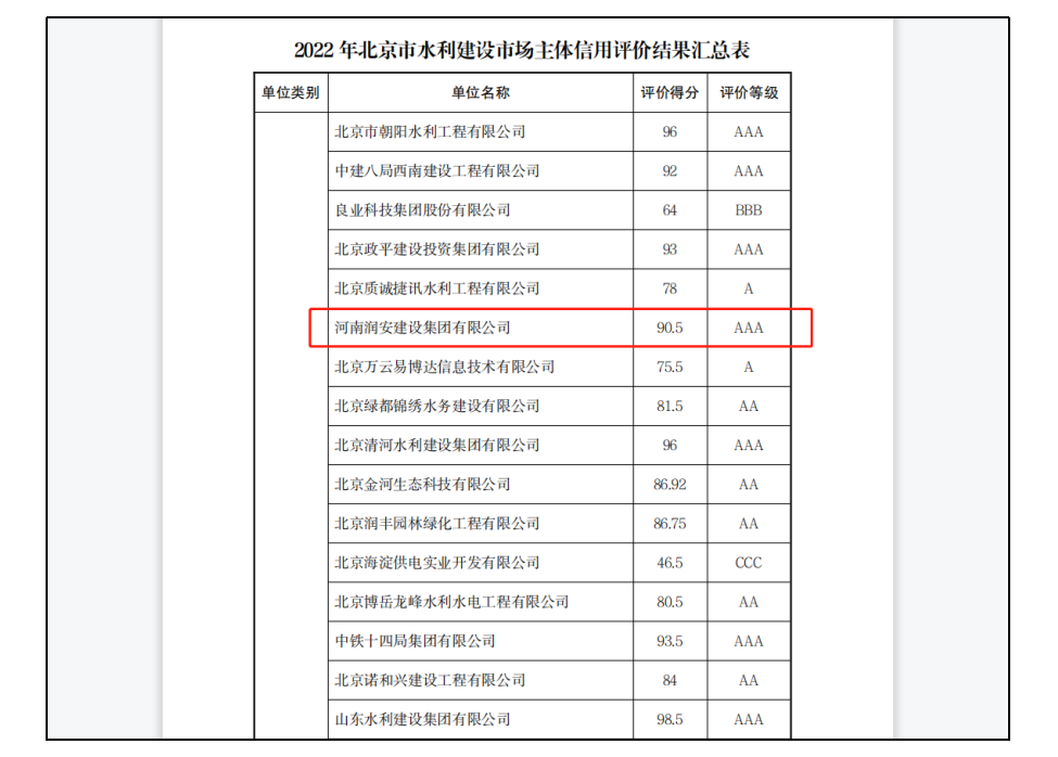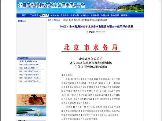 2022年12月22日,北京市水務(wù)局發(fā)布關(guān)于公告2022年北京市水利建設(shè)市場(chǎng)主體信用評(píng)價(jià)結(jié)果的通知,集團(tuán)公司以90.5的高分通過了此次評(píng)價(jià),獲得了高等級(jí)AAA級(jí)信用評(píng)價(jià),為集團(tuán)公司開拓水利業(yè)務(wù)打下了良好的基礎(chǔ)。