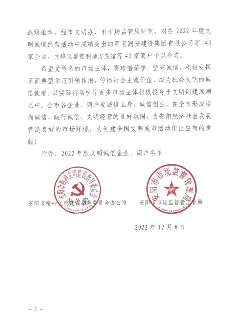 文件指出:為認(rèn)真貫徹落實(shí)市委、市政府關(guān)于創(chuàng)建全國文明城市的決策部署,進(jìn)一步強(qiáng)化市場主體文明經(jīng)營、誠信經(jīng)營、合法經(jīng)營的理念,組織全市市場主體廣泛開展了“文明誠信企業(yè)”、“文明誠信商戶”創(chuàng)評活動。通過各縣(市)、區(qū)文明辦和市場監(jiān)管局嚴(yán)格把關(guān)、逐級推薦,經(jīng)市文明辦、市市場監(jiān)管局研究,對在2022年度文明誠信經(jīng)營活動中成績突出的河南潤安建設(shè)集團(tuán)有限公司等143家企業(yè)予以命名。具體文件如下: 潤安集團(tuán)長期以來高度重視企業(yè)信用管理,堅(jiān)持誠信經(jīng)營,傾力打造“潤安”品牌。此次獲評文明誠信企業(yè),充分說明了潤安集團(tuán)在企業(yè)信譽(yù)、品牌建設(shè)方面得到了社會的高度認(rèn)可,也必將成為公司高質(zhì)量發(fā)展的強(qiáng)大推動力。 下步,潤安集團(tuán)將以此次表彰為契機(jī),以習(xí)近平新時代中國特色社會主義思想和黨的二十大精神為指引,時刻保持依法經(jīng)營、誠信納稅的理念,積極發(fā)揮正面典型示范,樹立文明誠信的良好形象,堅(jiān)持誠信立身、誠信創(chuàng)業(yè),為安陽經(jīng)濟(jì)社會發(fā)展?fàn)I造良好的市場環(huán)境,為創(chuàng)建文明城市助力加油,作出貢獻(xiàn)。
